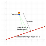 Chap 09내적 - Inner Product이번 9장에서는 길이 (length)와 직교 (perpendicular)의 개념이 수학적 용어로 어떻게 해석되는지 알아본다. 어떤 점에 가장 가까운 주어진 직선상의 점을 찾는 문제에 대해 살펴본다. 9.1 소방차 문제아래의 그림에서 좌표 에 위치한 집 에 화재가 났다고 하자. 집 주변을 지나가는 도로는 원점과 점 을 지나는 직선이면, 집 와 가장 가까운 직선상의 어떤 지점으로 소방차를 위치 시킬 수 있으면 화재를 진압 시킬 수 있다고 하면, 두 가지를 생각할 수 있다.직선상의 어느 점이 집 와 가까운가?그렇다면, 가장 가까운 거리는 얼마나 되는가? 이것을 계산문제로 재구성 해보자. 앞의 3.5.3 에서 처럼 원점을 지나는 직선은 벡터의 스칼라배들의..